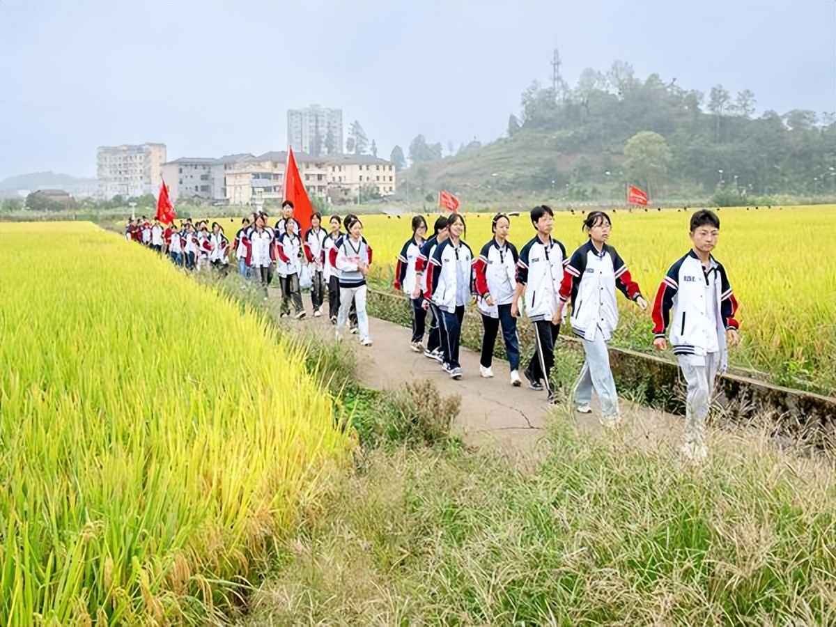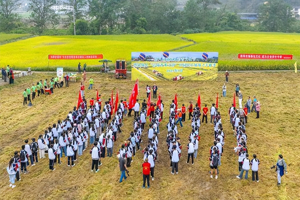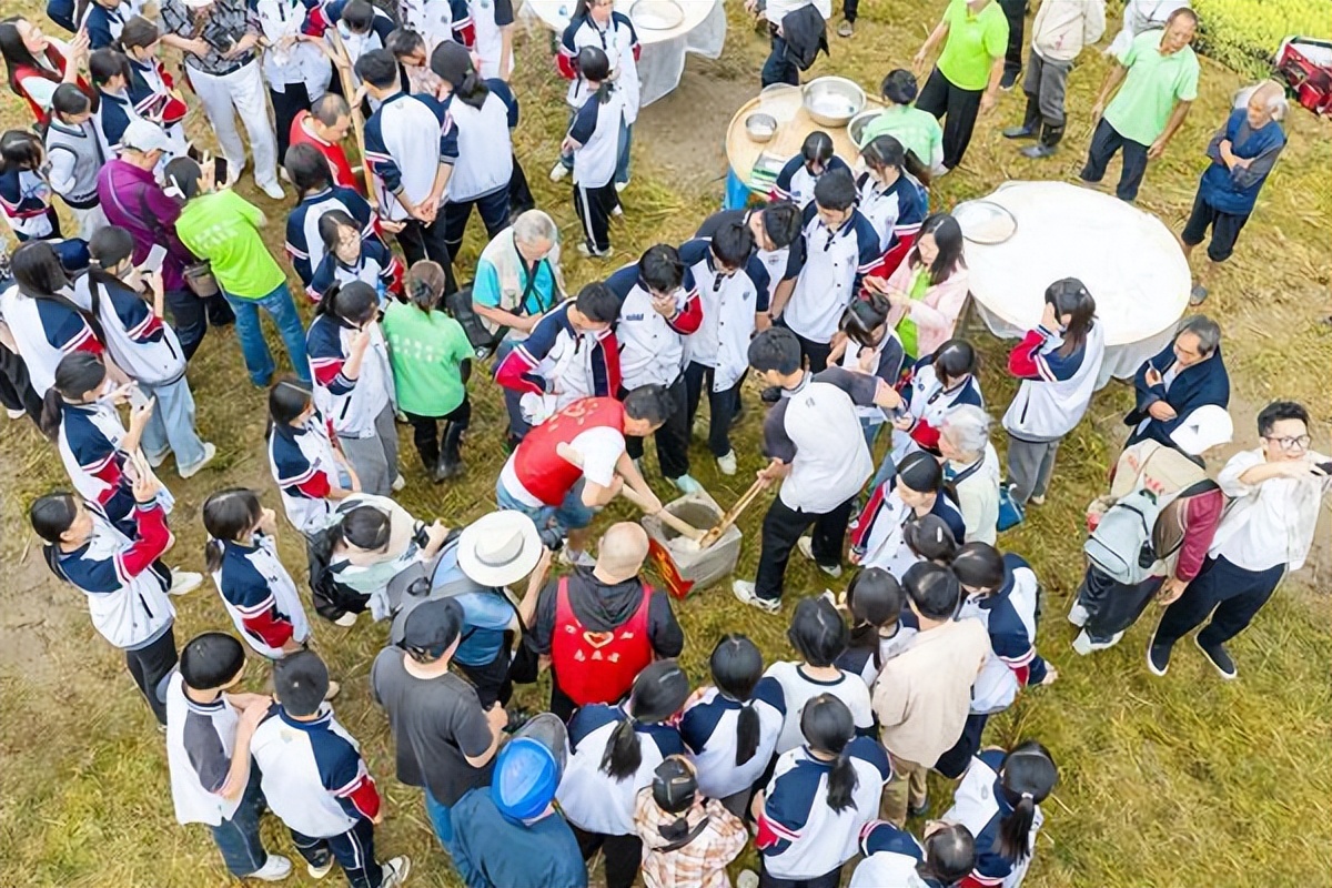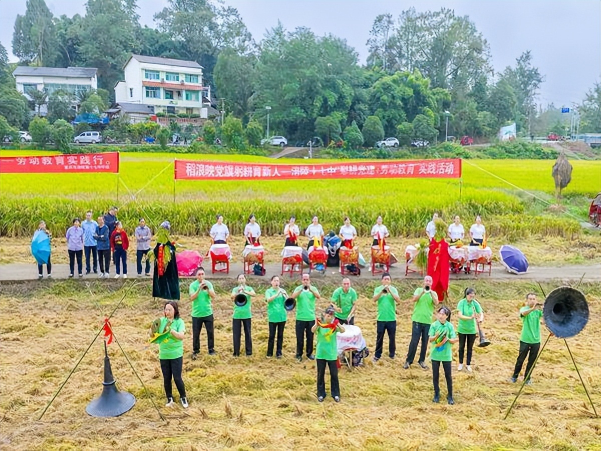 本次活动设置两条特色核心线路,同步开展精彩内容。在“红心向党,稻田实践”专场,涪陵十七中近200名师生在党员教师与农技师傅指导下,分批次参与农事实践:学习镰刀收割水稻、体验古法打谷脱粒,还开展“稻草人”创作、稻田寻宝、打糍粑等活动,在劳动中体会“粒粒皆辛苦”,培育勤俭节约与热爱劳动的品质。